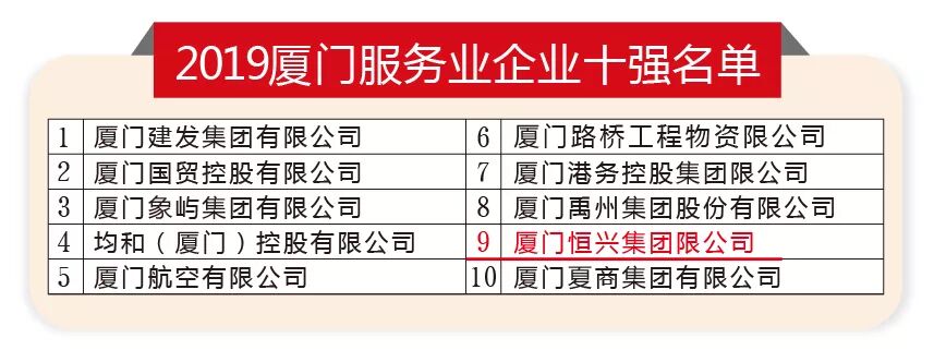 四個榜中榜——“2019廈門制造業(yè)企業(yè)十強”排行榜、“2019廈門服務(wù)業(yè)企業(yè)十強”排行榜、“2019新興產(chǎn)業(yè)專精特新企業(yè)十強”排行榜、“2019廈門綠色企業(yè)十強”排行榜也同步揭曉。廈門恒興集團位居“2019廈門服務(wù)業(yè)企業(yè)十強”第九位。