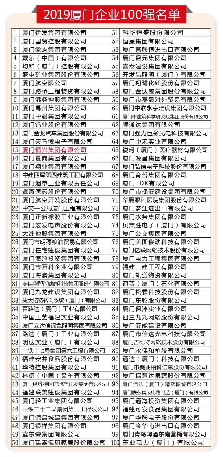 由廈門企業(yè)和企業(yè)家聯(lián)合會、廈門日報社、廈門廣電集團聯(lián)合主辦的“2019廈門企業(yè)100強”排序工作圓滿落幕,廈門恒興集團有限公司位居榜單第15位,這是恒興集團連續(xù)第八年入圍廈門百強榜單。