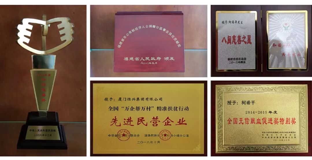 廈門恒興集團創(chuàng)辦二十余年來,始終秉承“誠信、責(zé)任、創(chuàng)新、共贏”的企業(yè)核心價值觀,不斷超越發(fā)展,贏得了社會各界的充分肯定,連續(xù)獲得數(shù)十項國家、省市各級、各類獎勵和表彰。在為社會創(chuàng)造財富和就業(yè)的同時,廈門恒興集團積極履行企業(yè)公民的責(zé)任和義務(wù),多年來積極投身公益辦學(xué)、慈善醫(yī)療等事業(yè),累計捐款捐物超4億元;并帶頭參與省級貧困村精準扶貧、與甘肅臨夏州的對口幫扶等行動。曾獲得國家民政部授予的“中華慈善獎”、全國工商聯(lián)和國務(wù)院扶貧辦授予的“全國萬企幫萬村精準扶貧行動先進民營企業(yè)”等公益獎項。廈門恒興集團創(chuàng)辦人、董事長柯希平先生曾被評為“全國非公有制經(jīng)濟人士優(yōu)秀中國特色社會主義事業(yè)建設(shè)者”、“全國無償獻血促進獎特別獎”、“改革開放40年40位福建最有影響力企業(yè)家”等榮譽。