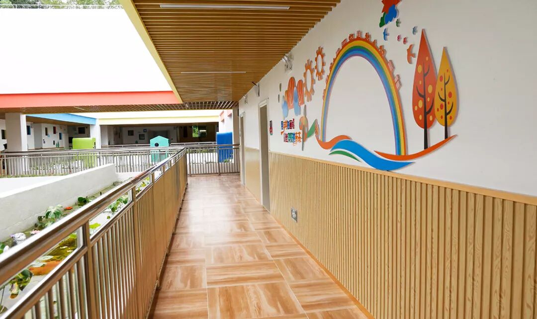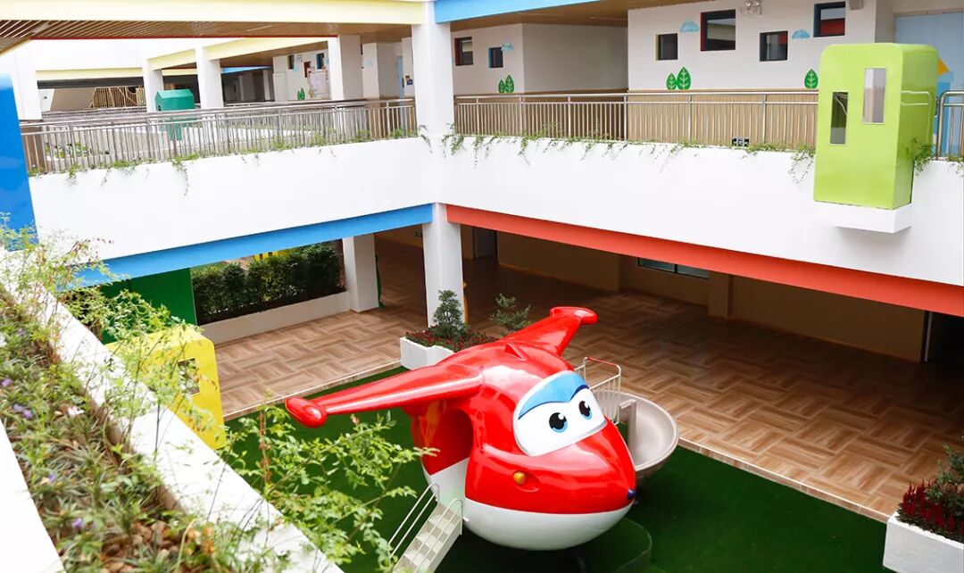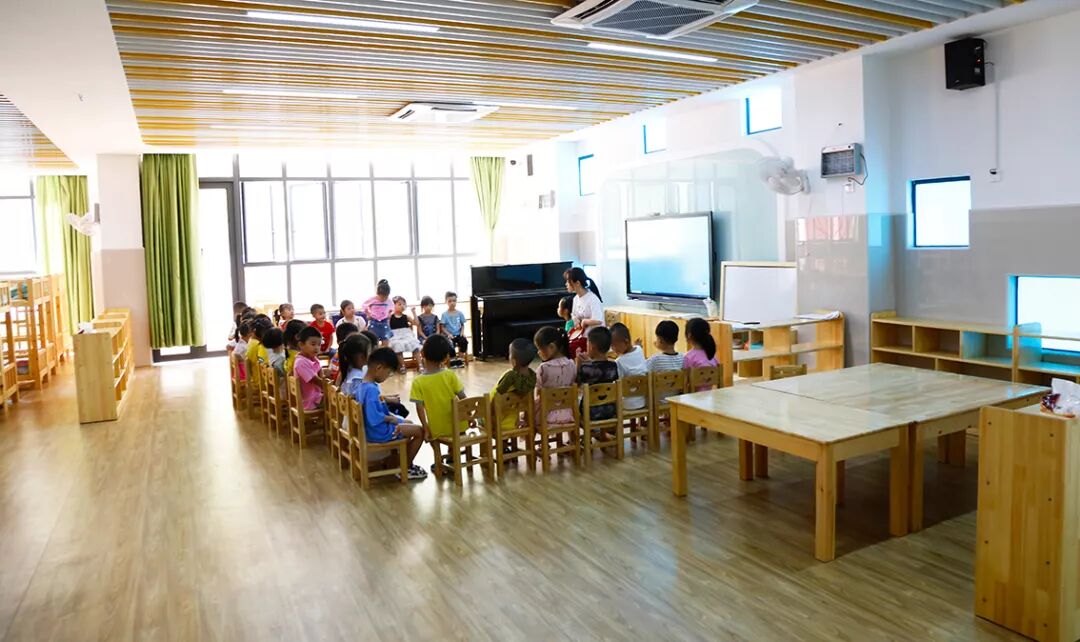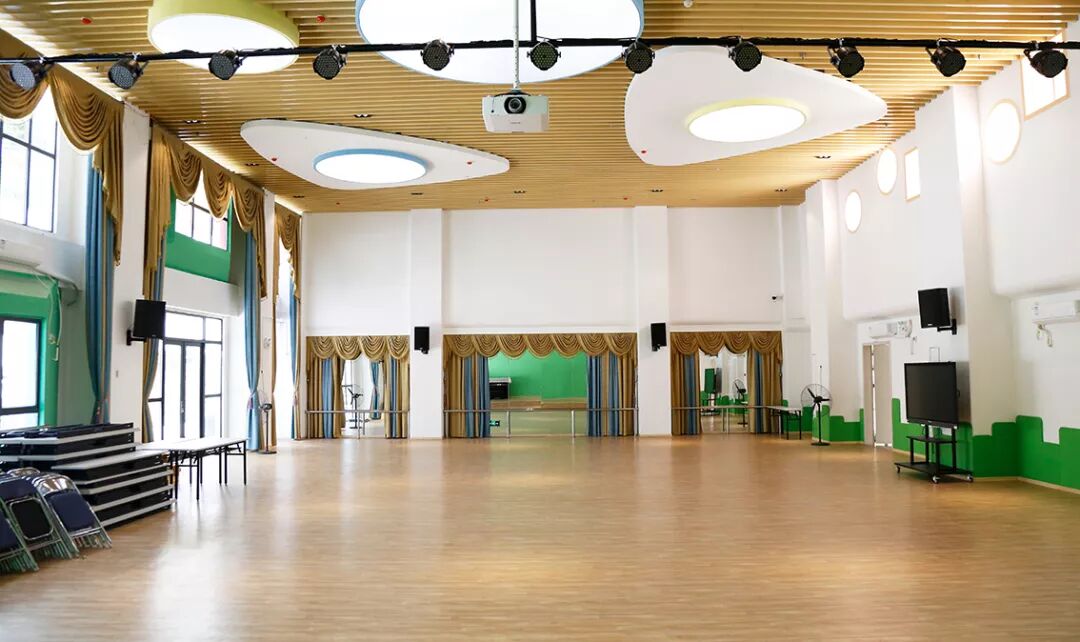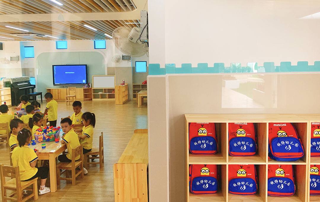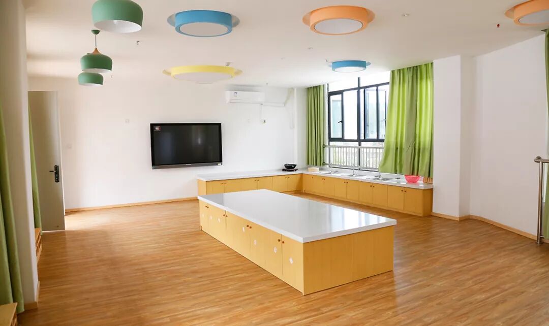 教學區(qū)域的設計更是獨具匠心。每一塊幼兒坐椅采用實木,適合幼兒坐姿,舒適可愛。盥洗室里白綠格子相間,顯得清新自然。幼兒園的閱讀室里各類兒童讀物應有盡有,還配備卡通讀書區(qū),讓幼兒在此可輕松閱讀。此外,手工室、美術室等多功能室配置齊全。