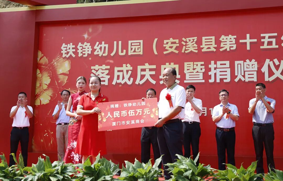 捐資儀式上,廈門市安溪商會向鐵錚幼兒園捐資伍萬元,會長鐘江波授捐資牌,鐵錚幼兒園副園長胡喜戀接牌。