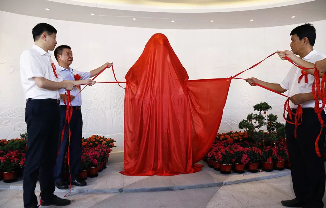 揭彩儀式上,史思泉先生、丁建銘先生、袁霖輝先生、柯希平先生共同為柯鐵錚先生銅像揭彩。