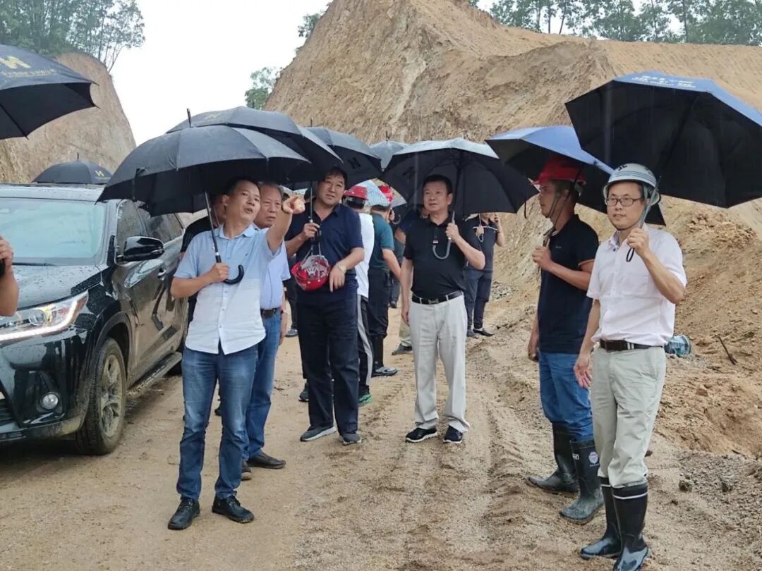 11日中午,柯希平董事長一行乘機抵達鄭州,直奔恒裕礦業(yè)五大在建工程現(xiàn)場。他們一路冒雨走過曹溝橋、跨越796高程點、翻過固廢綜合回收項目、途經(jīng)鉬選廠、登頂尾礦壩等建設(shè)現(xiàn)場。曹溝道路面層結(jié)構(gòu)組成有哪些?”“兩廠設(shè)備進場情況如何?”“尾礦庫大壩透水性能及初期壩體安全性能怎樣?”……沿著泥濘的山路,柯希平董事長邊走邊看,問得仔細,聽得認真。得知砂石料廠土建工程整體形象進度好、35KV變電站工程按期完工,他點頭稱贊,給予了充分肯定。