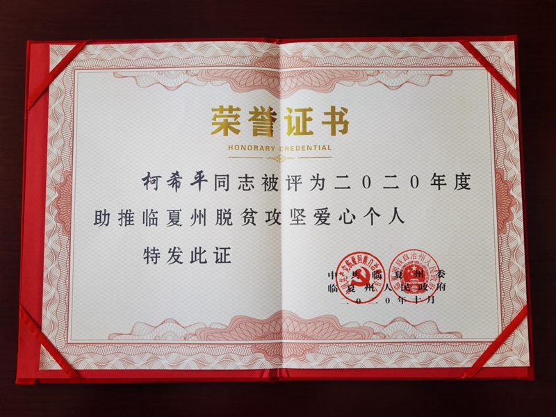 授予柯希平董事長(zhǎng)“助推臨夏州脫貧攻堅(jiān)愛(ài)心個(gè)人”